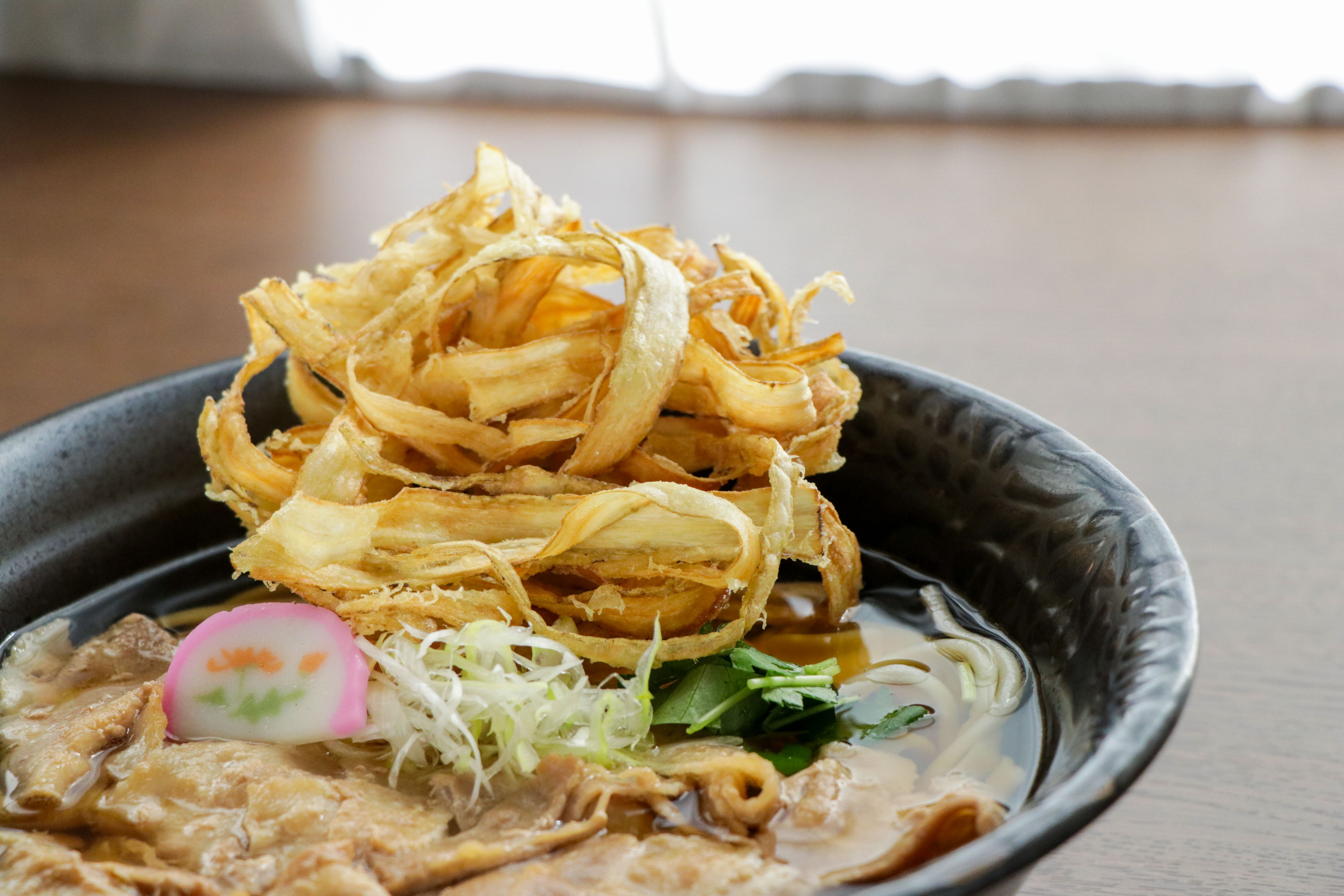 人気の肉うどんに薄切りにしたサクサクのごぼう天をトッピング。